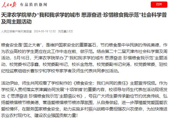 2024年5月19日,人民日报客户端天津频道报道我校举办“我和我求学的城市 思源奋进·珍惜粮食我示范”社会科学普及周主题活动。