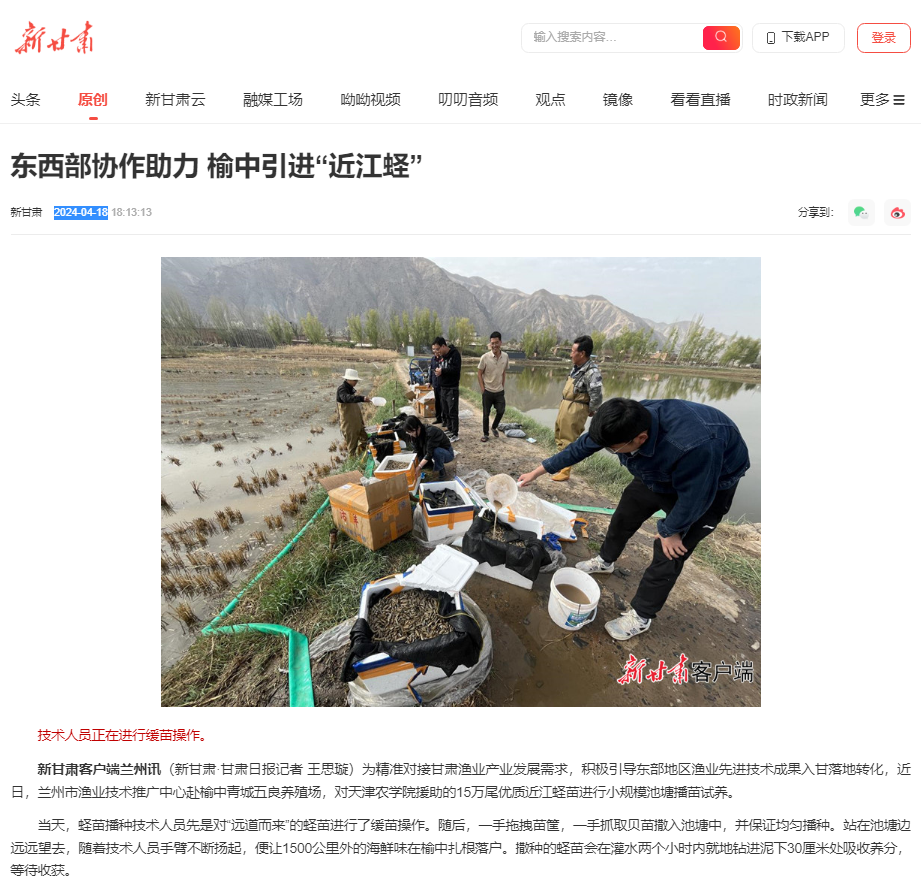 2024年4月18日,新甘肃客户端报道国家贝类产业技术体系天津综合试验站成员、津甘双地科技特派员、我校水产学院实验师梁健与兰州市渔业技术推广中心合作,援助兰州市榆中青城五良养殖场15万粒近江蛏苗种,开展池塘试养工作。