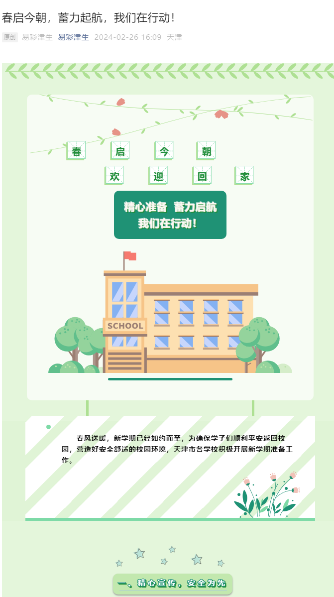 2024年2月26日,易彩津生公众号报道我校通过返校安全、财产安全、宿舍安全、健康安全等方面的安全提示,助力学生顺利返校。