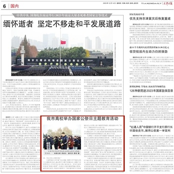 2023年12月14日,天津日报报道,在第十个南京大屠杀死难者国家公祭日到来之际,我校组织开展“铭记历史 思源奋进”主题教育活动。升旗仪式后,李月玲教授为师生讲授“微思政课”。我校天津市“青马工程”培训班学员、人文学院2020级学生郝春蕾说:“作为新时代青年,我们要把爱国之情化为报国之行,勇担时代使命,努力报效祖国。”