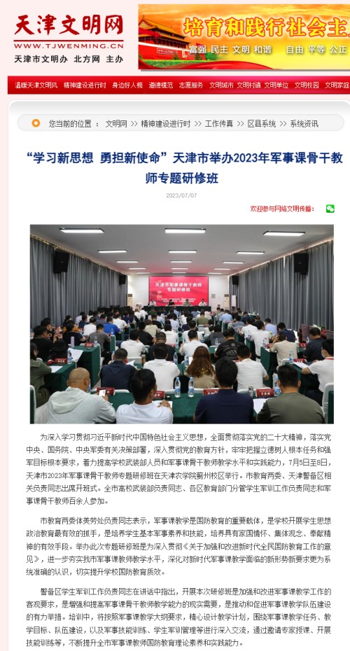 2023年7月7日,天津文明网报道天津市2023年军事课骨干教师专题研修班在我校蓟州校区举行。市教育两委、天津警备区相关负责同志出席开班式。全市高校武装部负责同志、各区教育部门分管学生军训工作负责同志和军事课骨干教师百余人参加。