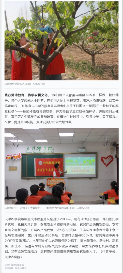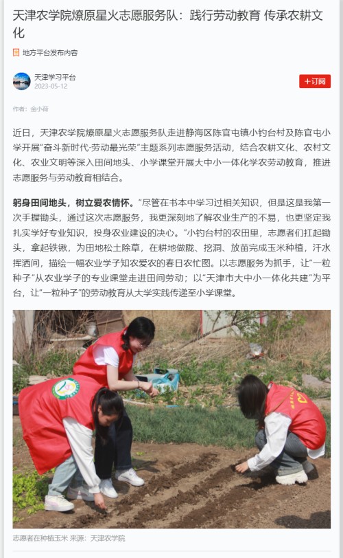2023年5月12日,学习强国平台—天津学习平台报道我校经济管理学院燎原星火志愿服务队走进静海区陈官屯镇小钓台村及陈官屯小学开展“奋斗新时代·劳动最光荣”主题系列志愿服务活动。