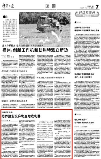 2022年11月2日,《科技日报》第07版以《特派员徐晓燕:把养殖业废弃物变增收利器》为题报道了我校徐晓燕教授团队的科技帮扶事迹。徐晓燕教授建立了“企业+科技特派员+核心技术基地+农户”四位一体的科技推广模式,由科技特派员进行技术推广与培训,在核心技术基地进行技术示范,农户运用新技术进行生产,企业收购产品,将农户生产纳入企业的生产链条,实现农户和企业的深度融合发展。