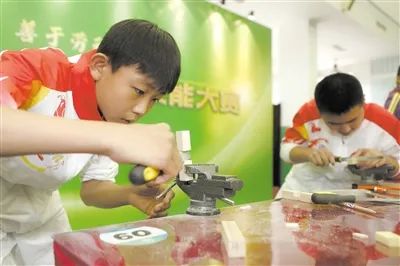 天津市首届中小学劳动技能大赛上,选手在木工项目中进行比拼。陈欣然 摄