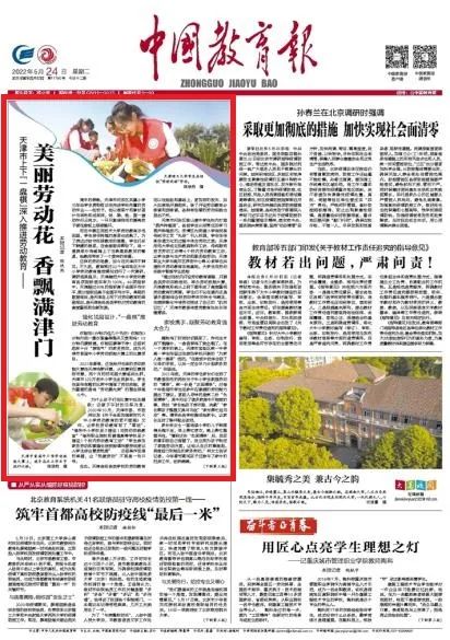 5月24日,《中国教育报》头版头条以“天津市上下‘一盘棋’深入推进劳动教育 ——美丽劳动花 香飘满津门”为题,报道了我校推动大中小学一体化劳动教育工作。