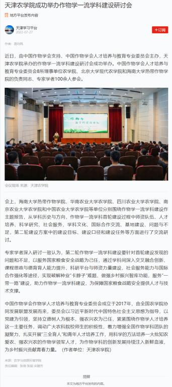 近日,由中国作物学会支持、中国作物学会人才培养与教育专业委员会主办,威客电竞承办的作物学一流学科建设研讨会成功举办。中国作物学会人才培养与教育专业委员会8所理事单位农学院、北京大学现代农学院和海南大学热带作物学院的负责同志、专家学者100余人参会。