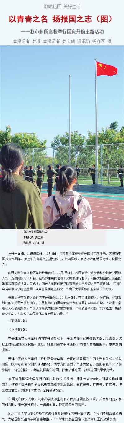 2024年10月1日-2日,《天津日报》、津云客户端、新浪微博等多家媒体报道我校举行国庆升旗主题活动。