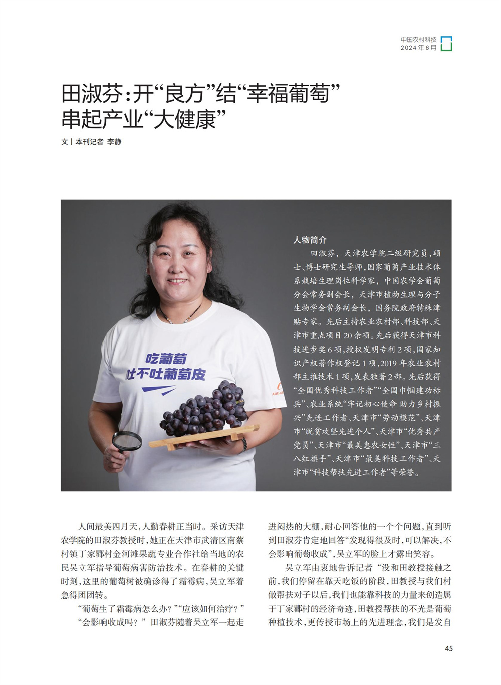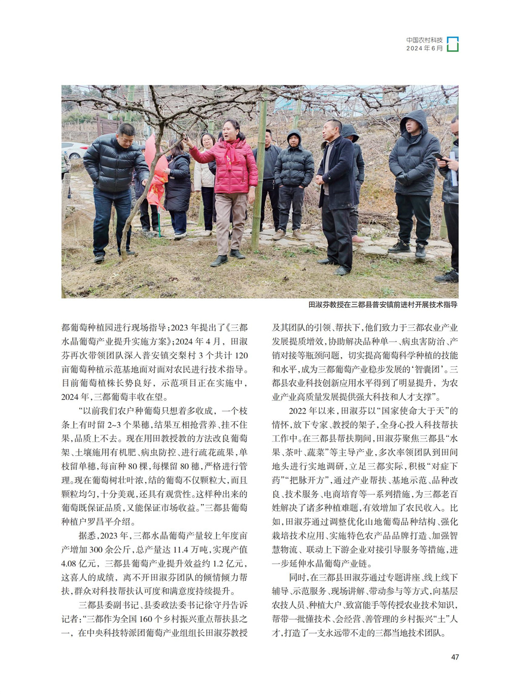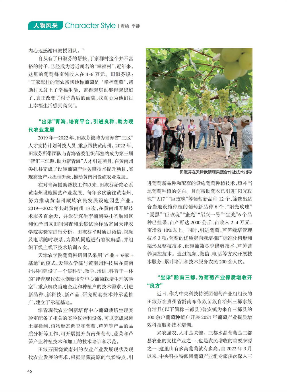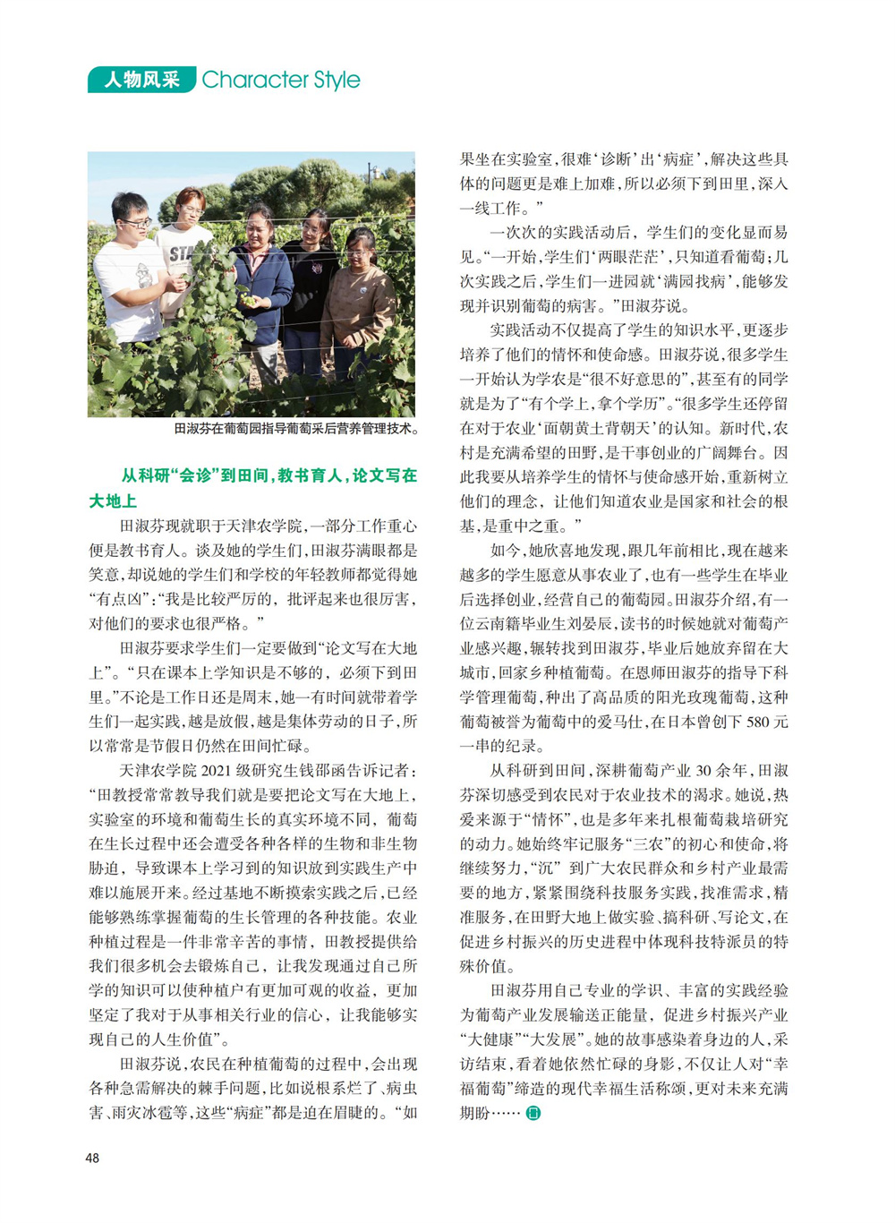 2024年6月,《中国农村科技》杂志《人物风采》专栏刊发了国家葡萄产业技术体系栽培生理岗位科学家、我校园艺园林学院田淑芬研究员助力葡萄产业振兴、带动当地村民增收的事迹。