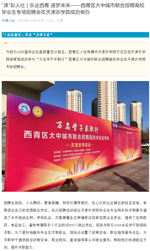 2024年12月3日,天津人社公众号、西青人社公众号报道,为助力2025届毕业生高质量充分就业,西青区人社局携手我校于近日在体育馆成功举办“万名学子求职行”西青区大中城市联合招聘高校毕业生威客电竞专场招聘会。