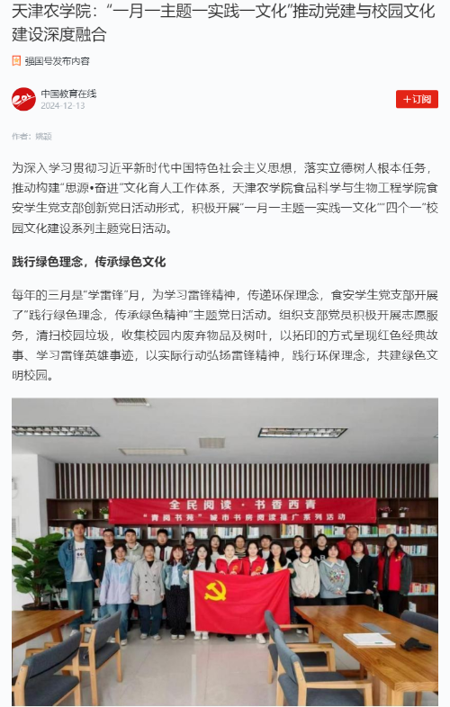 2024年12月12-13日,学习强国平台、中国教育在线网、天津支部生活公众号等媒体报道,我校食品科学与生物工程学院食安学生党支部创新党日活动形式,积极开展“一月一主题一实践一文化”校园文化建设系列主题党日活动。