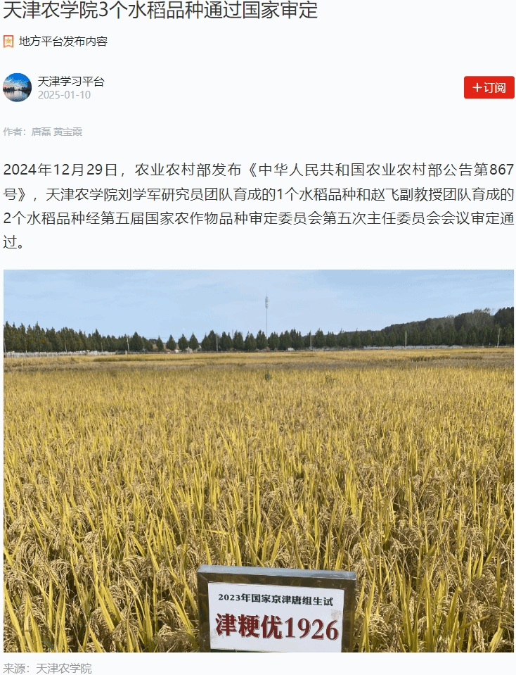2025年1月7日-10日,学习强国平台-天津学习平台、学习强国平台-中国教育在线、中国教育在线网报道,农业农村部发布《中华人民共和国农业农村部公告第867号》,我校刘学军研究员团队育成的1个水稻品种和赵飞副教授团队育成的2个水稻品种经第五届国家农作物品种审定委员会第五次主任委员会会议审定通过。