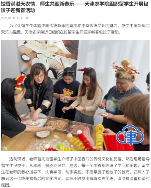 2025年1月11日,津云报道,我校近日组织在校留学生开展迎新春包饺子活动,让留学生体验中国传统新年的氛围和中华传统文化的魅力,感受中国新年的欢乐与温馨。