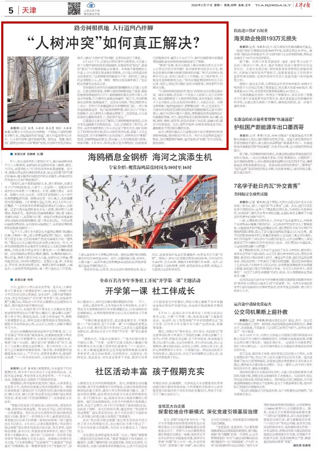 2025年02月17日,《天津日报》第5版头条报道,我校园艺园林学院黄俊轩副教授就“如何解决树根顶路面”的问题进行解答和建议。
