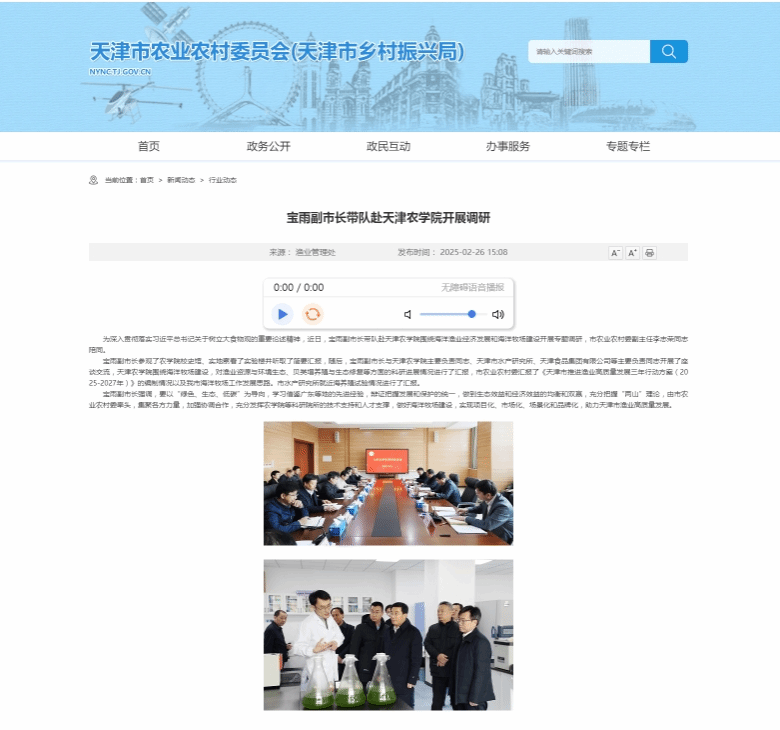 2025年2月26日,天津市农业农村委员会网站报道宝雨副市长带队到我校围绕海洋渔业经济发展和海洋牧场建设开展专题调研,市农业农村委副主任李志荣同志陪同。