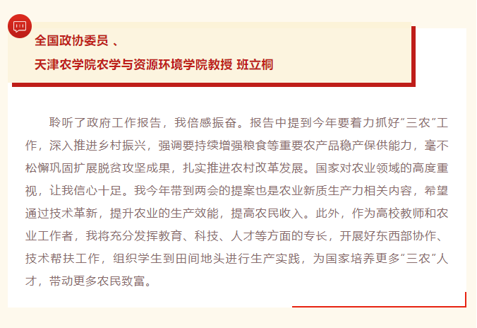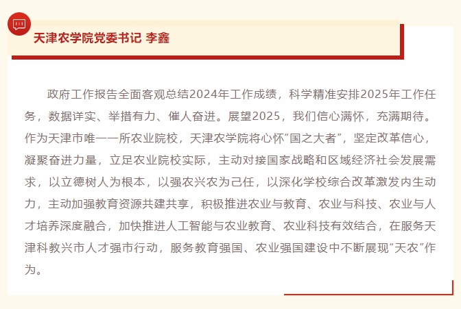 2025年3月5日,津门教育公众号报道我校党委书记李鑫和全国政协委员、农学与资源环境学院班立桐教授结合自身工作和学习实际,热议全国两会。