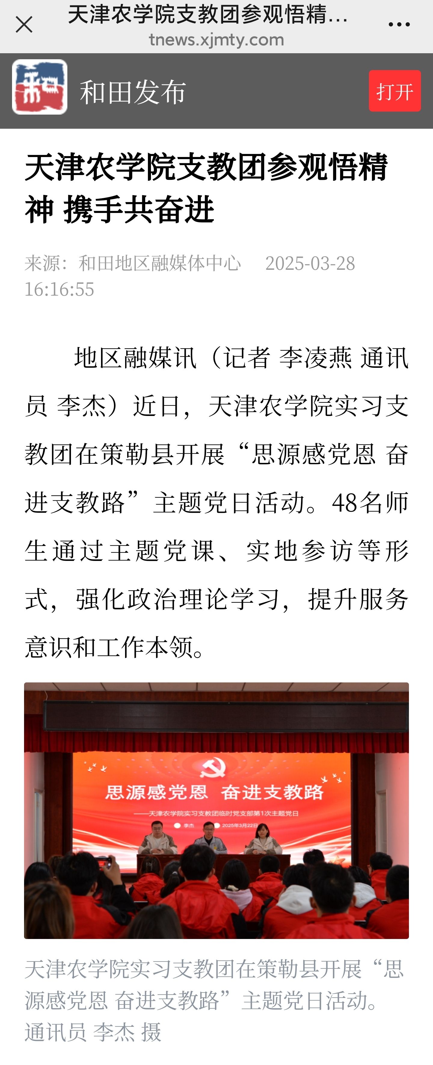 2025年3月28日,和田发布客户端报道我校实习支教团在策勒县开展“思源感党恩 奋进支教路”主题党日活动。48名师生通过主题党课、实地参访等形式,强化政治理论学习,提升服务意识和工作本领。