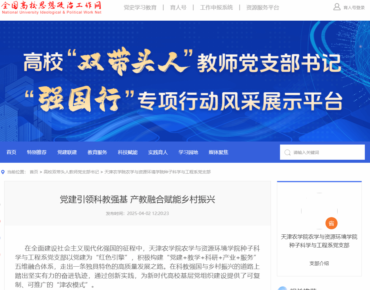 2025年4月2日,全国高校思想政治工作网刊登我校农学与资源环境学院种子科学与工程系党支部以党建为“红色引擎”,积极构建“党建+教学+科研+产业+服务”五维融合体系,走出一条独具特色的高质量发展之路。