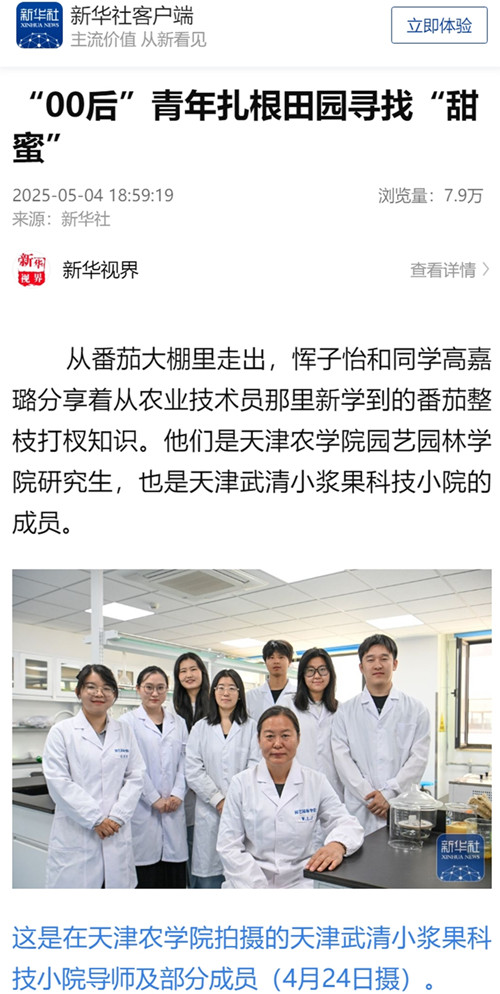 2025年5月4日,新华社客户端报道,我校园艺园林学院研究生、天津武清小浆果科技小院成员们从校园步入田间大棚,把论文书写在祖国大地上,在泥土中绽放青春。