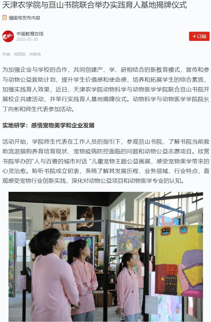 2025年5月20日,学习强国平台-中国教育在线、中国教育在线网报道,我校动物科学与动物医学学院联合亘山书院开展校企共建活动,并举行实践育人基地揭牌仪式。
