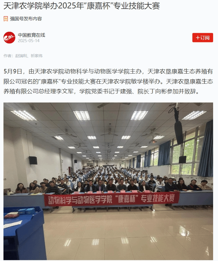 2025年5月14日,学习强国平台-中国教育在线、中国教育在线网报道,由我校动物科学与动物医学学院主办,天津农垦康嘉生态养殖有限公司冠名的“康嘉杯”专业技能大赛在敏学楼举办。