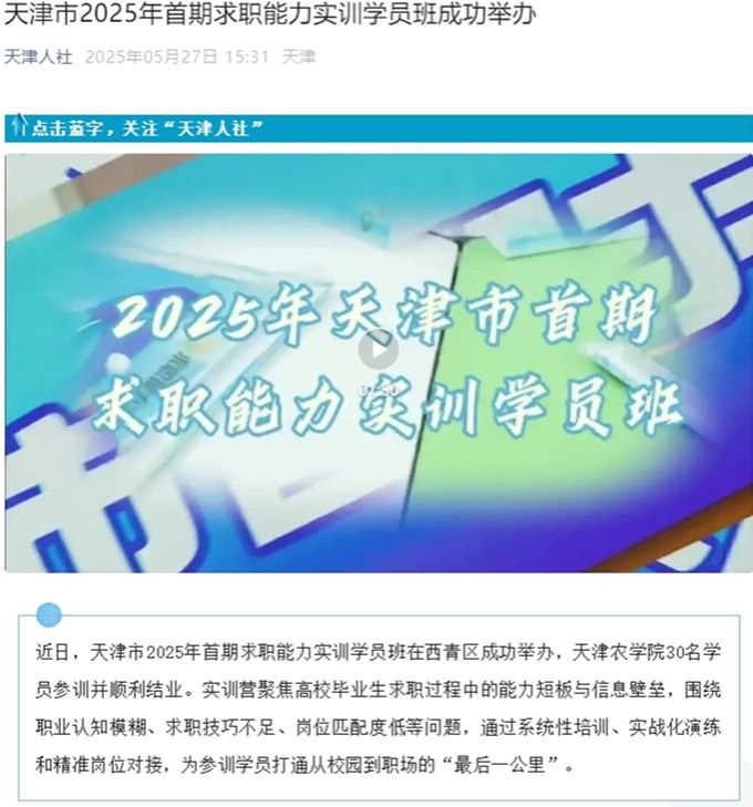 2025年5月27日,天津人社公众号报道天津市2025年首期求职能力实训学员班在西青区成功举办,我校30名学员参训并顺利结业。