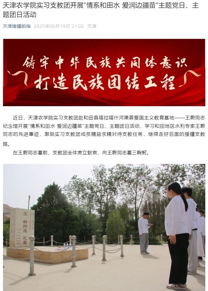 2023年6月19日,天津援疆前指公众号报道我校实习支教团赴和田县喀拉喀什河渠首爱国主义教育基地——王蔚同志纪念馆开展“情系和田水 爱润边疆苗”主题党日、主题团日活动,学习和田地区水利专家王蔚同志的先进事迹,激励实习支教团成员精益求精对待支教任务,继续走好后面的援疆支教路。