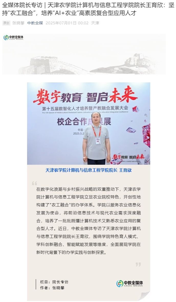 2025年7月1日,中教全媒体专访了我校计算机与信息工程学院院长王育欣,围绕学院特色育人模式、学科创新融合、智能赋能发展等维度,全面展现学院在新时代背景下的办学实践与创新探索。