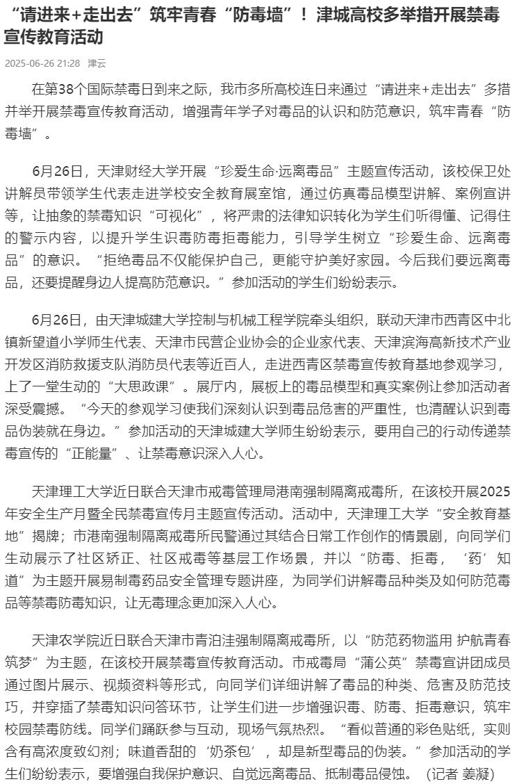 2025年6月26日,津云报道我校联合天津市青泊洼强制隔离戒毒所,以“防范药物滥用 护航青春筑梦”为主题,在该校开展禁毒宣传教育活动。