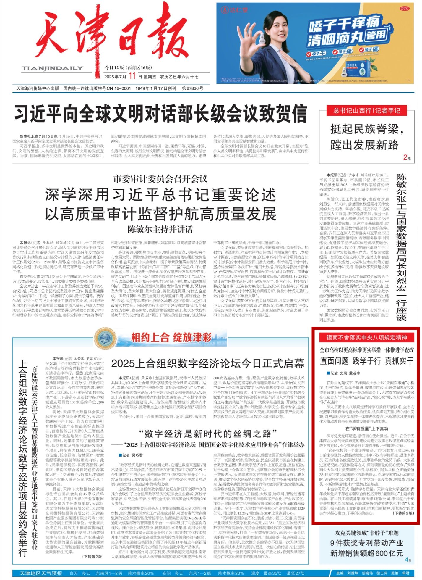2025年7月11日,《天津日报》、津门教育公众号报道,深入贯彻中央八项规定精神学习教育开展以来,我校把学习教育作为重大政治任务,认真谋划安排、精心组织实施,以更高标准更实举措一体推进学查改,不断将学习成果转化为推动教育事业高质量发展的生动实践。