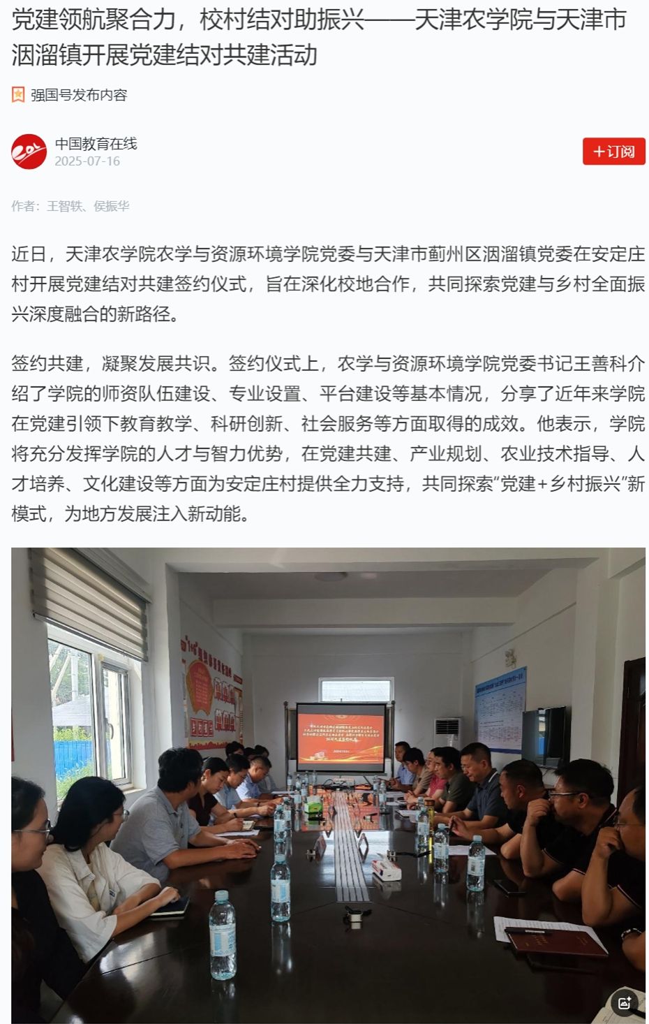 2025月7月16日,学习强国平台-中国教育在线、中国教育在线网报道,我校农学与资源环境学院党委与天津市蓟州区洇溜镇党委在安定庄村开展党建结对共建签约仪式,旨在深化校地合作,共同探索党建与乡村全面振兴深度融合的新路径。
