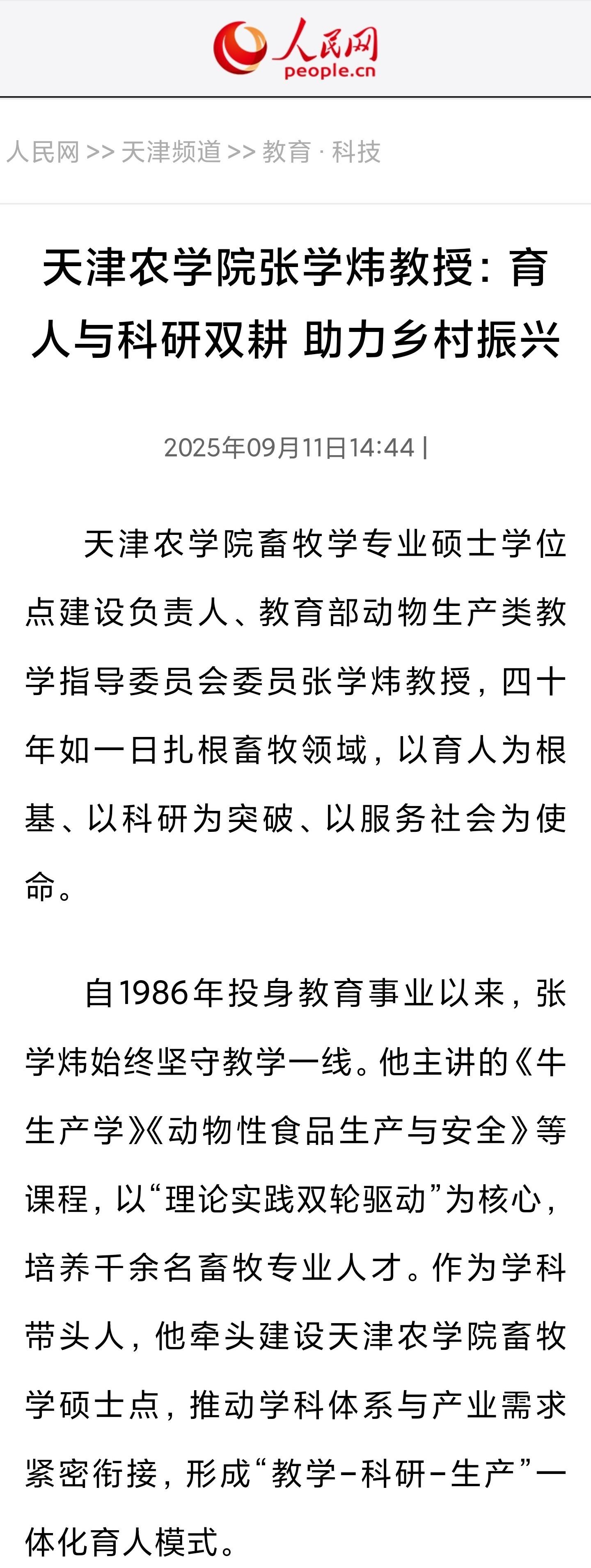 2025年9月11日,人民网报道我校动物科学与动物医学学院张学炜教授四十年如一日扎根畜牧领域,以育人为根基、以科研为突破、以服务社会为使命。