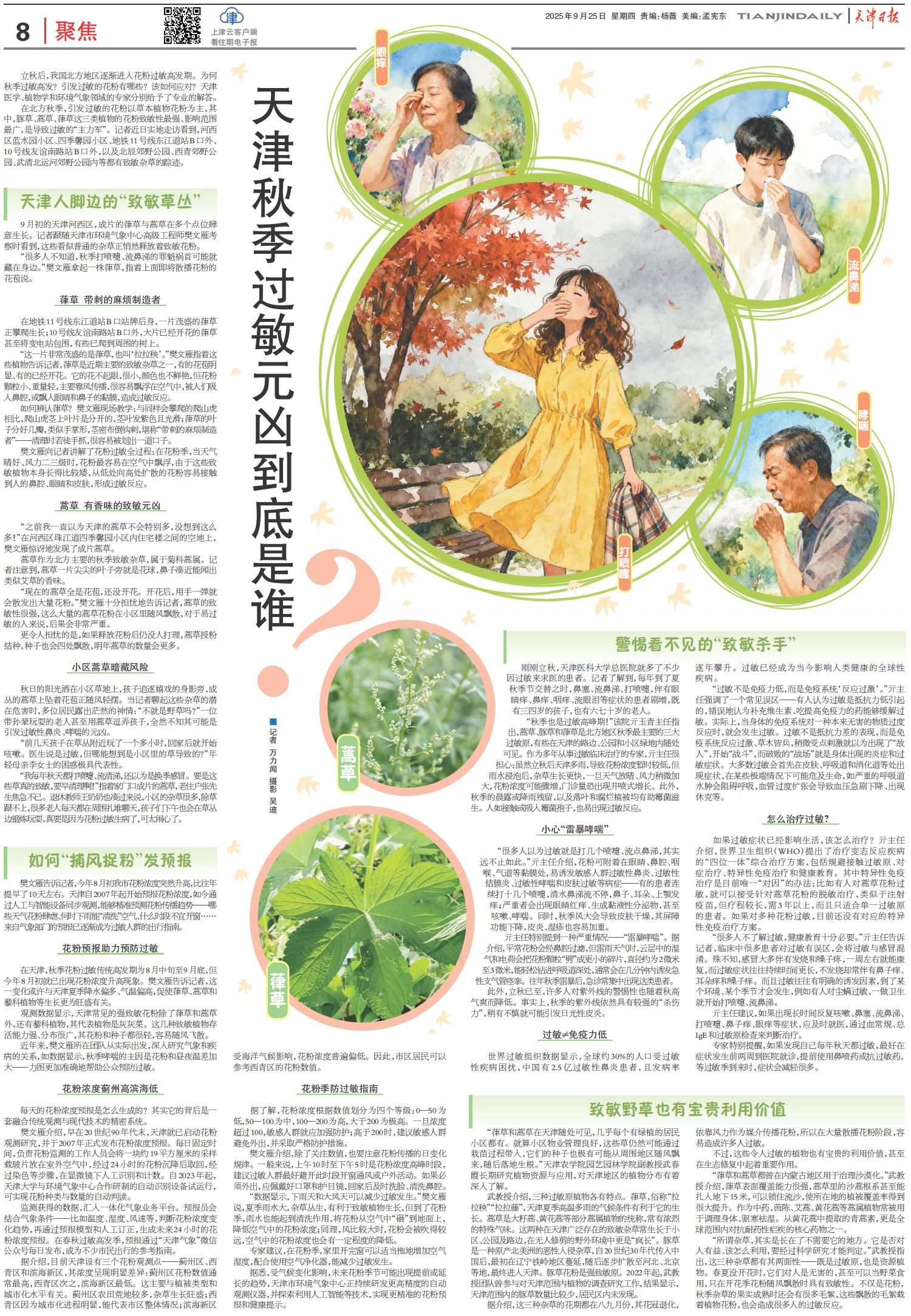 2025年9月25日,《天津日报》第08版报道,我校园艺园林学院武春霞副教授就“天津秋季过敏元凶”相关问题进行解答。