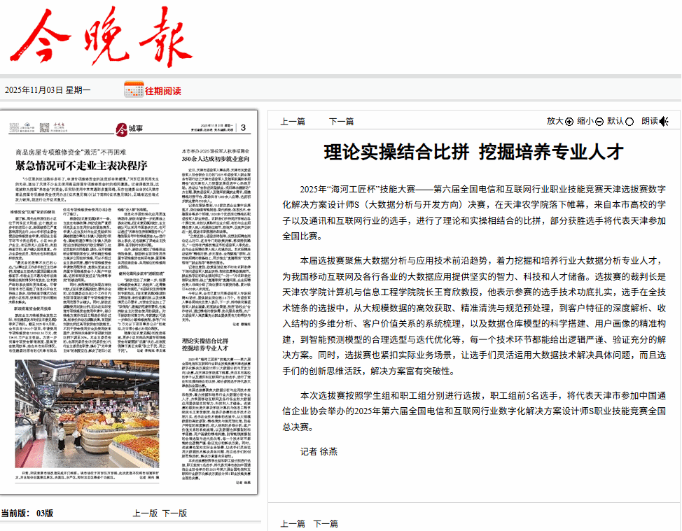 2025年11月3日,《今晚报》报道,2025年“海河工匠杯”技能大赛——第六届全国电信和互联网行业职业技能竞赛天津选拔赛数字化解决方案设计师S(大数据分析与开发方向)决赛,在我校落下帷幕,来自本市高校的学子以及通讯和互联网行业的选手,进行了理论和实操相结合的比拼,部分获胜选手将代表天津参加全国比赛。
