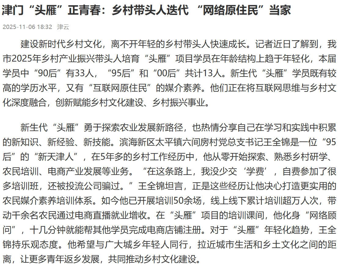 2025年11月6日,津云报道,我校“头雁”学员既有较高的学历水平,又有“互联网原住民”的媒介素养。他们正在将互联网思维与乡村文化深度融合,创新赋能乡村文化建设、乡村振兴事业。