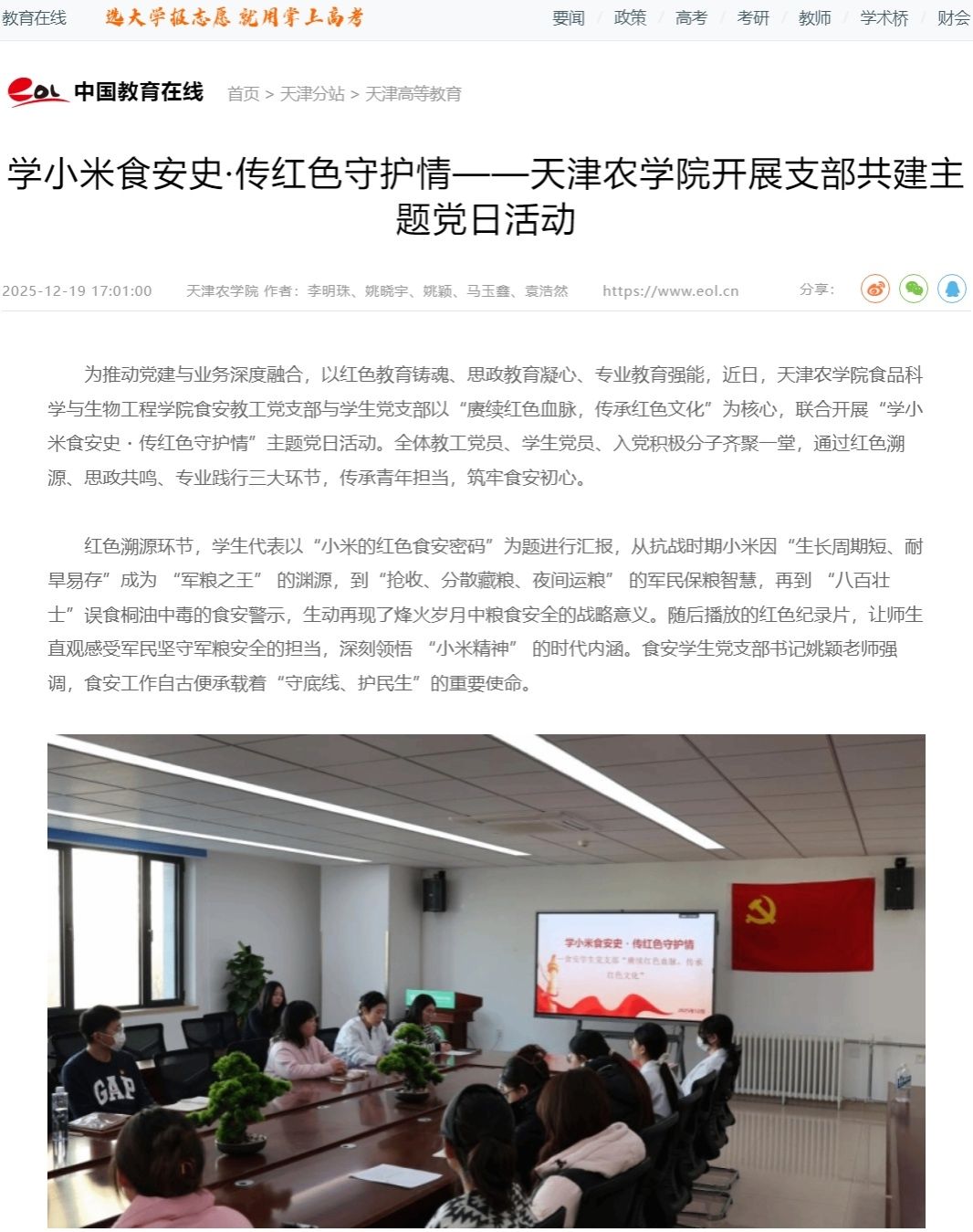 2025年12月19日,中国教育在线网报道我校食品科学与生物工程学院开展“学小米食安史·传红色守护情”支部共建主题党日活动。