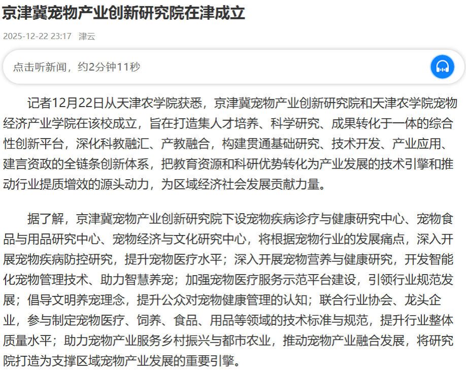 2025年12月22日,津云报道京津冀宠物产业创新研究院在京津冀宠物产业创新研究院和威客电竞宠物经济产业学院在我校成立,旨在打造集人才培养、科学研究、成果转化于一体的综合性创新平台。
