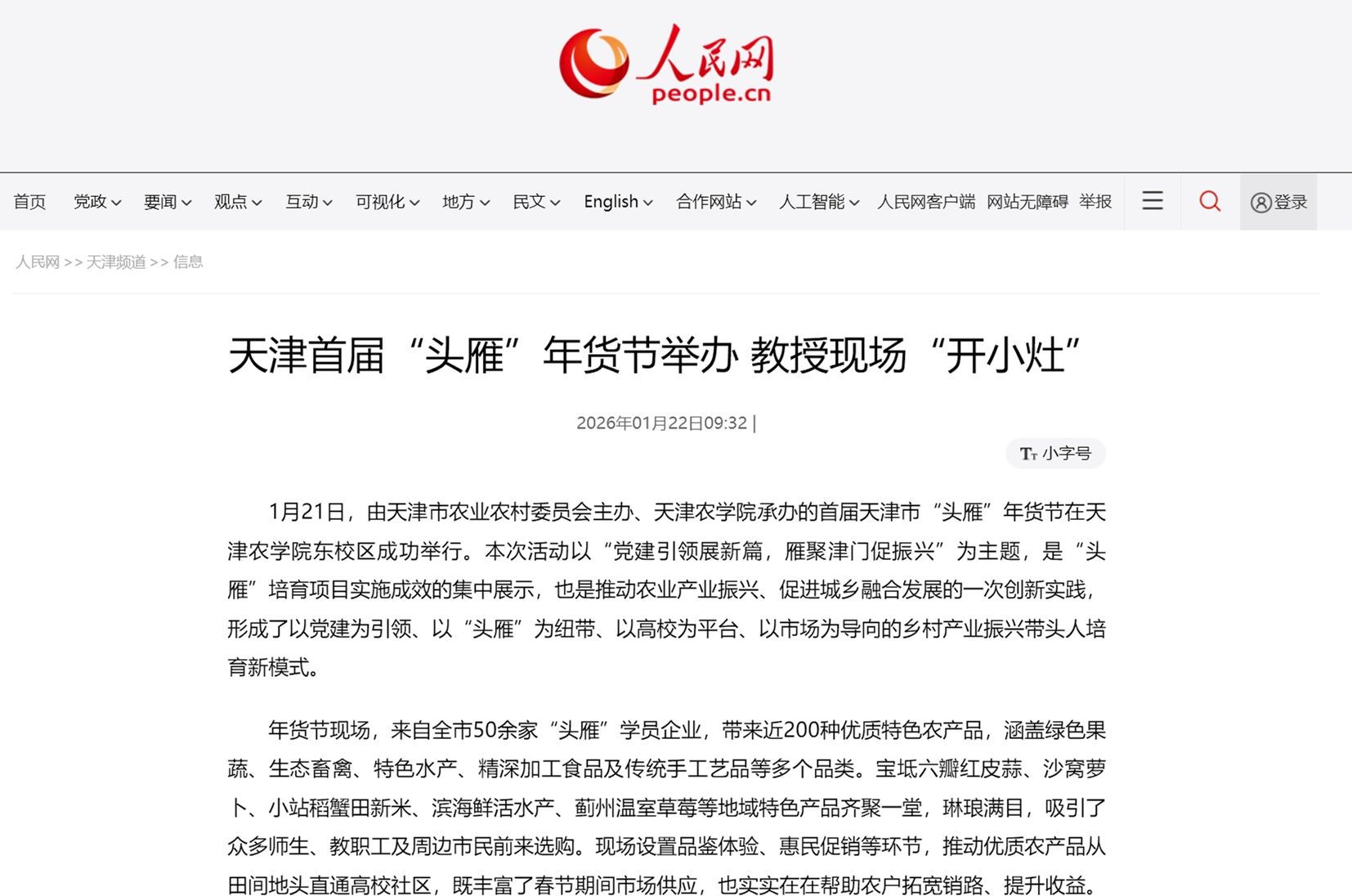 2026年1月22日,人民网报道,由天津市农业农村委员会主办、威客电竞承办的首届天津市“头雁”年货节在我校举行。