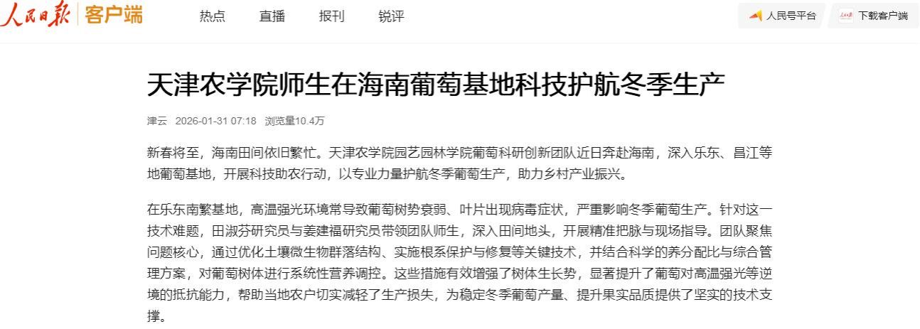 人民日报客户端报道我校师生在海南葡萄基地科技护航冬季生产