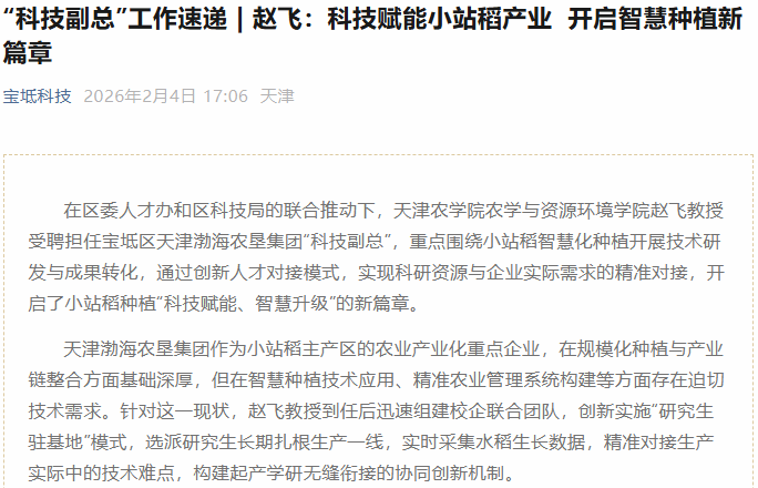 2026年2月4日,宝坻科技公众号报道,我校农学与资源环境学院赵飞教授受聘担任宝坻区天津渤海农垦集团“科技副总”,重点围绕小站稻智慧化种植开展技术研发与成果转化,通过创新人才对接模式,实现科研资源与企业实际需求的精准对接,开启了小站稻种植“科技赋能、智慧升级”的新篇章。