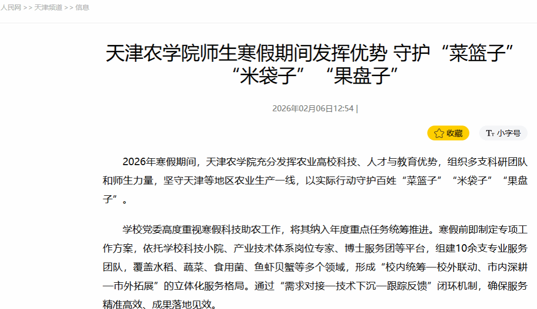 2026年2月6日,人民网报道,寒假期间,我校充分发挥农业高校科技、人才与教育优势,组织多支科研团队和师生力量,坚守天津等地区农业生产一线,以实际行动守护百姓“菜篮子”“米袋子”“果盘子”。