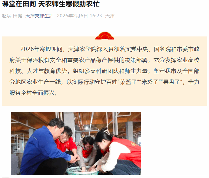 2026年2月6日,天津支部生活公众号报道,我校充分发挥农业高校科技、人才与教育优势,组织多支科研团队和师生力量,坚守我市及全国部分地区农业生产一线,以实际行动守护百姓“菜篮子”“米袋子”“果盘子”,全力服务乡村全面振兴。