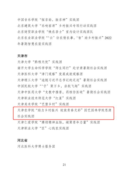 近日,团中央对2022年“三下乡”社会实践活动中表现突出的优秀集体、个人和项目进行通报表扬。经校级评审、省级团委审核推荐、组织评议等环节,我校“助力乡村振兴 绽放青春光彩”园艺园林学院思源社会实践团荣获全国“三下乡”社会实践优秀团队。