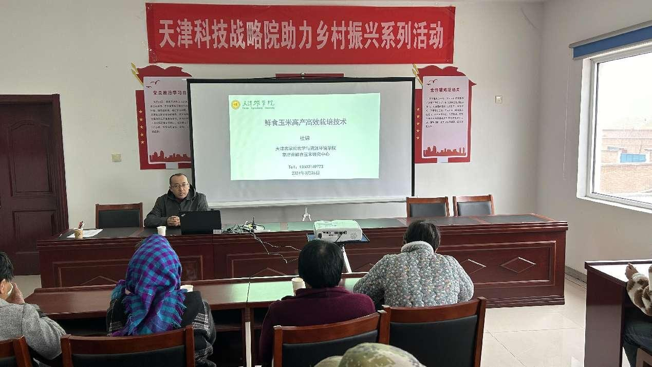 农民培训,提升操作技能。团队建立了多元化的培训体系,包括定期举办技术培训班、实地指导和技术交流会等形式。这些培训内容涵盖了鲜食玉米产业现状、绿色高效栽培、水肥一体化、农业智能化、鲜食玉米深加工等各个方面,针对不同示范户的需求,量身定制了培训计划,确保培训效果最大化。2024年已经在蓟州区、静海区等开展多场技术培训,第一年尝试种植鲜食玉米的大户和合作社均对项目组推广的鲜食玉米品种产生浓厚兴趣,今年开展小面积试验和示范。